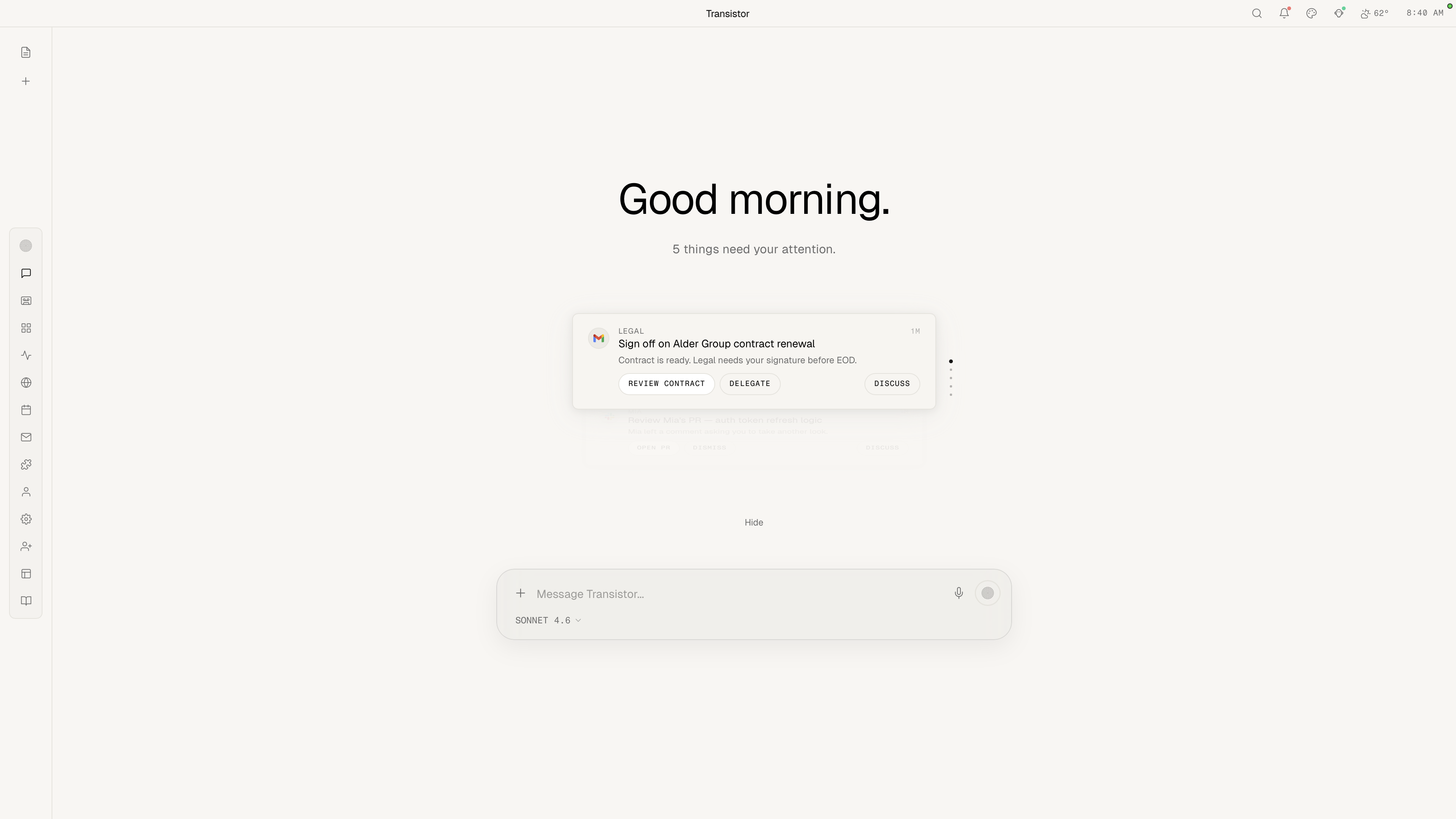 Your agent works seamlessly between your external tools and the apps inside Transistor. Context flows in both directions — your CRM data informs your morning briefing, your meeting notes update your project board, your calendar drives your agent's priorities.